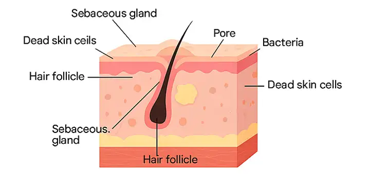 Acne in men is often linked to overactive sebaceous glands (excess oil/sebum), mixing with dead skin cells and bacteria, clogging pores and causing inflammation. Hormonal factors, genetics, and certain medications.